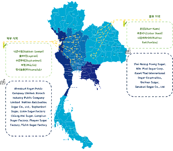 ● 동북부 지역: 콘깬(Khon Kaen), 우돈타니(Udon Thani), 나콘라차시마(Nakhon Ratchasima) 등은 넓은 농경지를 바탕으로 사탕수수 재배가 활발하게 이루어지고 있습니다.