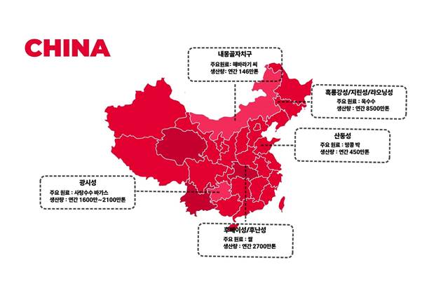● 흑룡강성, 지린성, 랴오닝성: 이 지역은 옥수수 생산이 활발한 곳으로, 매년 약 8,500만 톤 이상의 옥수수가 생산됩니다. 옥수수의 부산물인 옥수수 줄기와 껍질, 옥수수 잎 등은 바이오매스 연료로 활용될 수 있습니다. 특히 옥수수 부산물은 연료화 과정에서 높은 에너지 효율을 보이며, 대규모 농업 지역에서 지속 가능한 에너지 생산을 위한 중요한 자원으로 주목받고 있습니다.