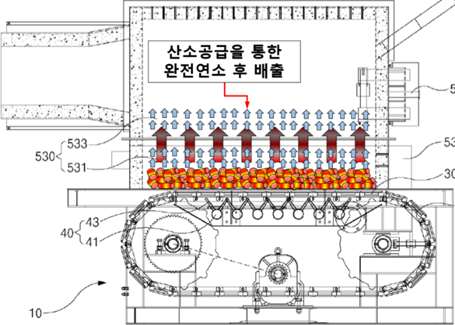 - 본 기술의 핵심 기술인 연소실(연소로)은 ①하부연소실 ②상부연소실 ③로스톨부 ④공기분사부 ⑤산소분사부로 구성된다. 하부연소실에서 1차연소(직접연소), 2차연소(CHAR연소, 증발연소), 상부연소실에서 3차연소(연소가스연소)가 이루어져 바이오매스를 연료로 사용하는 산업용 보일러의 완전연소를 유도하는 것이 핵심 기술 및 특징이다.