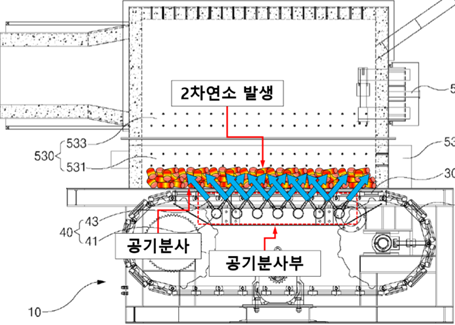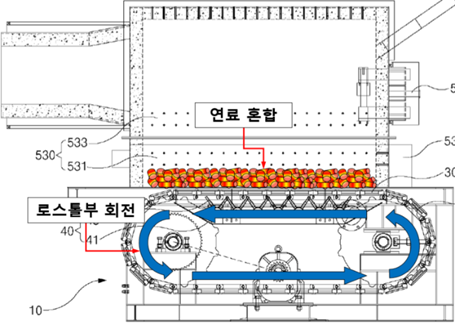 | ③ | 로스톨부 | 하부연소실에 설치되며, 컨베이어벨트의 작동에 의해 고형의 바이오매스 연료를 원주방향으로 회전시키는 장치 |