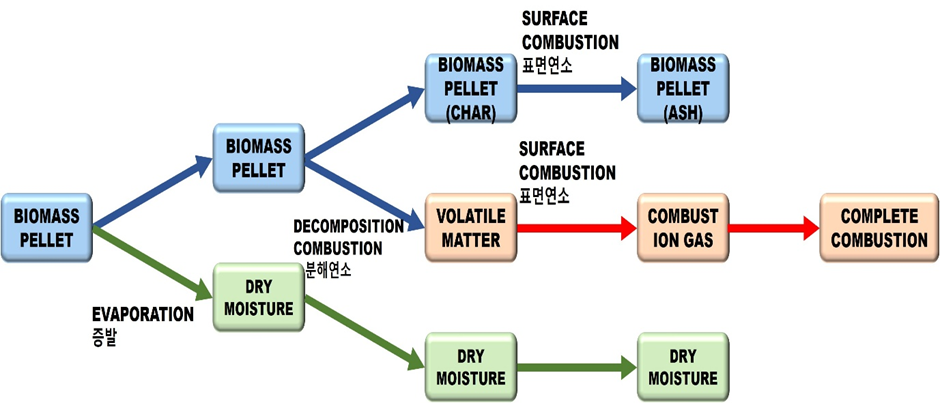 바이오매스 펠릿의 연소반응(건조 탈휘발 및 숯 연소) 단계는 상기 그림과 같이 나타낼 수 있다. 바이오매스의 탄화 속도는 열분해와 열 발생의 상호작용에 영향을 받으며 이는 바이오매스의 종류, 밀도, 함수율, 열 침투성, 열적특성과 같은 많은 변수들의 함수이다 고체연료는 대부분 연소를 통해 소각하여 열을 이용하고 있는데 바이오매스는 석탄과 비교하면 상대적으로 수분이 많다. 따라서 초기 펠릿이 온도가 증가되면 증발이 일어나 건조수분이 발생되고 이후 분해연소를 통하여 휘발성분이 발생되며 남은 펠릿은 숯(Char)으로 변한다 다음, 최종단계로 표면연소를 통하여 숯(CHAR)은 재(Ash)로 변하고 휘발분은 연소가스로 변한다 여기서 표면연소는 다시 완전연소 및 기상연소(Vapor Combustion)로 나누어 일어나게 된다. 은 이러한 전체 연소과정에서 바이오매스펠릿이 완전연소되어 연기가 발생하지 않는 시스템이다.